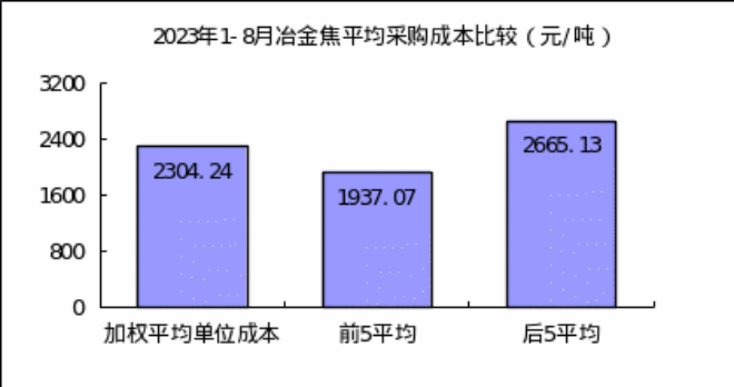1—8月對標企業冶金焦平均采購成本最低的前5家企業的加權平均采購成本為1937.07元/噸,比對標企業平均采購成本低367.17元/噸,低於平均采購成本15.93%;而采購成本最高的5家企業的加權平均采購成本為2665.13元/噸,比對標企業平均采購成本高360.89元/噸,高於平均采購成本15.66%。