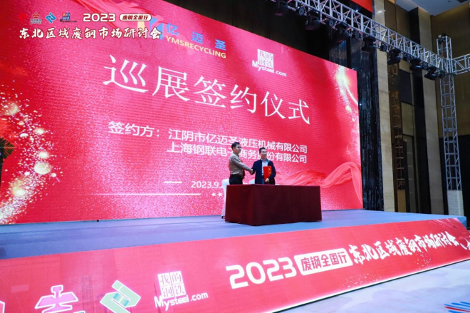 之後,進入2023廢鋼全國行設備企業巡展簽約儀式。江陰市億邁聖液壓機械有限公司總經理夏見清、上海鋼聯資訊總監徐向春上台分別代表雙方在合作協議書簽字。