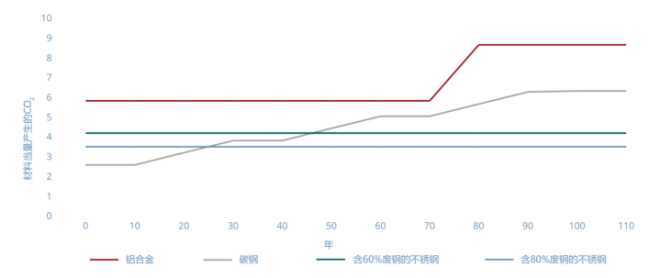 此外,與不鏽鋼相關的全生命周期排放為可持續和適用材料的選用提供了一個不同的、更引人注目的視角。對於大部分產品和裝置,約70%的全生命周期排放發生在使用或運行階段,因此選擇不會失效且不需大量維護或部分更換的材料,會帶來不同且低得多的碳排放情況。