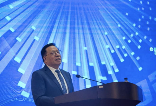 圖為中國搜索信息科技股份有限公司黨委書記、董事長、總裁李勁鬆作主題演講。