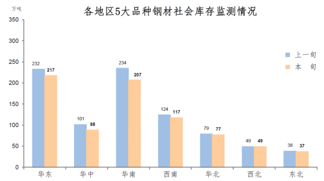 11月上旬,分地區來看,七大區域庫存除西北環比持平外,其他地區均有所下降,具體情況為:華南庫存環比減少27萬噸,下降11.5%,為減量最大地區;華東減少15萬噸,下降6.5%;華中減少13萬噸,下降12.9%,為降幅最大地區;西南減少7萬噸,下降5.6%;華北減少2萬噸,下降2.5%;東北減少1萬噸,下降2.6%;西北地區庫存環比持平。