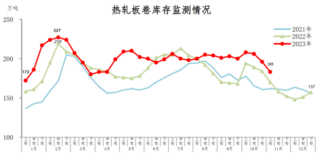 11月上旬,熱軋板卷庫存183萬噸,環比減少13萬噸,下降6.6%,庫存繼續快速下降;比年初增加26萬噸,上升16.6%;比上年同期增加13萬噸,上升7.6%。