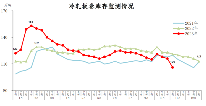 11月上旬,冷軋板卷庫存106萬噸,環比減少10萬噸,下降8.6%,庫存降幅加深;比年初減少7萬噸,下降6.2%;比上年同期減少15萬噸,下降12.4%。