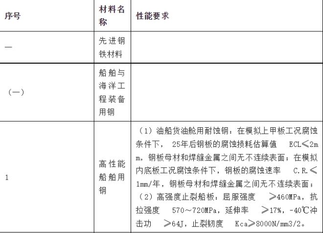 該意見稿中,居首的是“先進基礎材料”中的“先進鋼鐵材料”部分。該部分又分為六大塊:船舶與海洋工程裝備用鋼、交通裝備用鋼、能源裝備用鋼、航空航天用鋼、電子信息用鋼、其他,具體如下:
