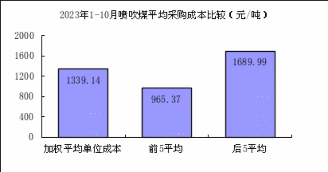 噴吹煤10月份加權平均折算成幹基的采購成本為1252.09元/噸,環比升高110.77元/噸,升幅為9.71%。1—10月累計平均折算成幹基的采購成本為1339.14元/噸,同比下降304.77元/噸,降幅為18.54%。