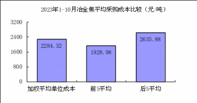 冶金焦10月份加權平均折算成幹基的采購成本2264.64元/噸,環比升高137.61元/噸,升幅為6.47%。1—10月累計平均折算成幹基的采購成本為2284.32元/噸,同比下降711.23元/噸,降幅為23.74%。
