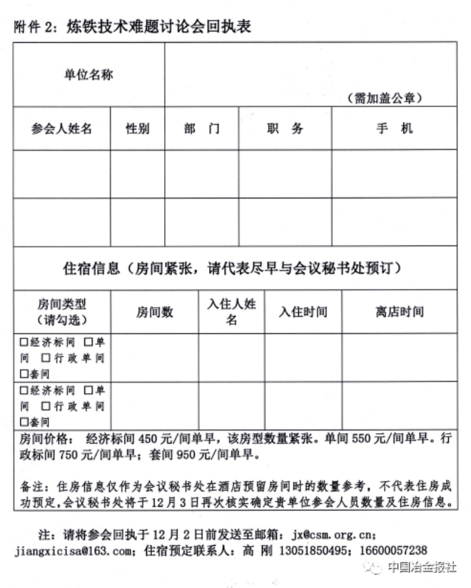 3. 本次會議參會人員,列席參與12月6-7日第三屆全國煉鐵副總技術工作座談會,安排統一與12月6-7日第三屆全國煉鐵副總技術工作座談會會務安排一致。