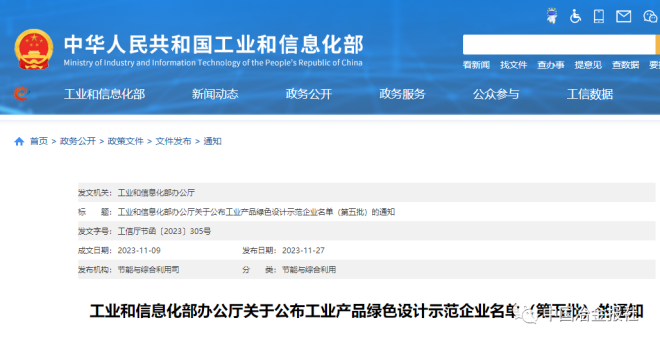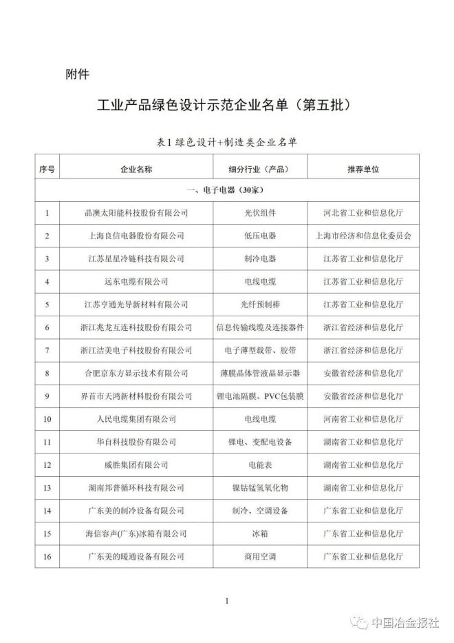 11月27日,工業和信息化部網站發布通知,公布工業產品綠色設計示範企業名單(第五批)。其中,冶金領域有5家企業上榜,名單如下: