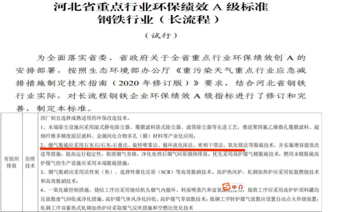 河北省發布了長流程鋼鐵企業環保績效A級標準(試行)——煙氣脫硫技術中取消了活性炭(焦)幹法脫硫工藝
