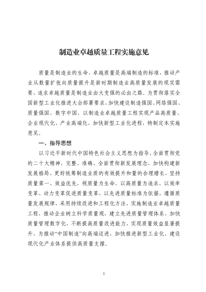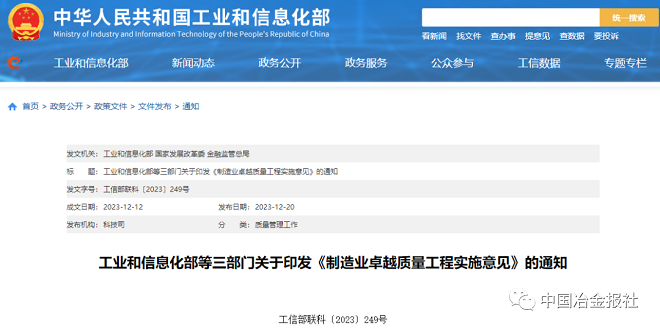 近日,工業和信息化部網站發布了工業和信息化部等三部門關於印發《製造業卓越質量工程實施意見》的通知(以下簡稱《通知》)。