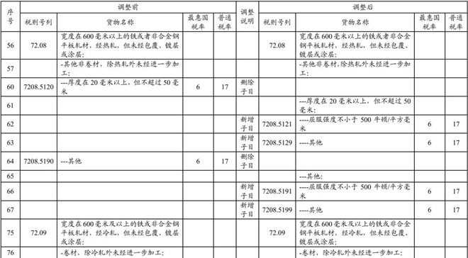 附表 新關稅政策涉及的鋼鐵產品稅則稅目調整情況