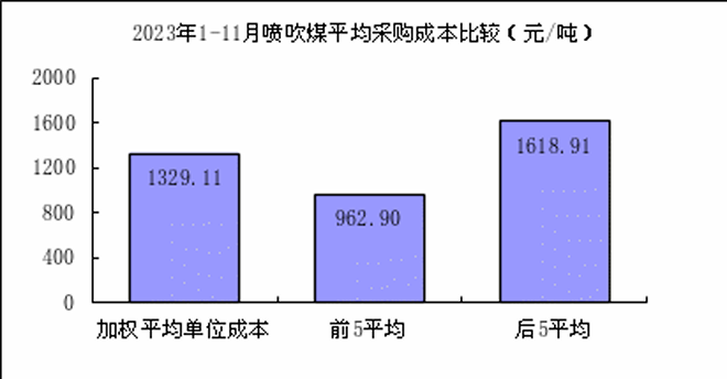 噴吹煤11月份加權平均折算成幹基的采購成本為1247.22元/噸,環比下降4.86元/噸,降幅為0.39%。1—11月累計平均折算成幹基的采購成本為1329.11元/噸,同比下降337.87元/噸,降幅為20.27%。