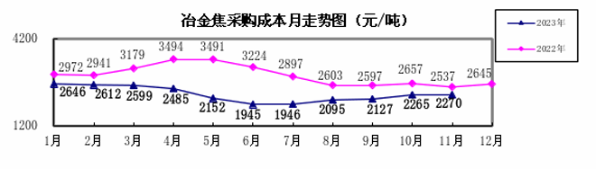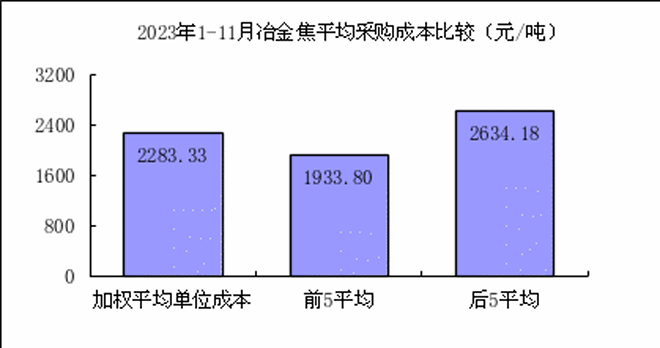 冶金焦11月份加權平均折算成幹基的采購成本2270.28元/噸,環比升高5.63元/噸,升幅為0.25%。1—11月累計平均折算成幹基的采購成本為2283.33元/噸,同比下降666.30元/噸,降幅為22.59%。