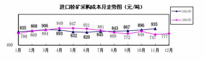 進口粉礦11月份加權平均采購成本934.58元/噸,環比升高38.20元/噸,升幅為4.26%。1—11月累計平均采購成本為867.29元/噸,同比升高16.27元/噸,升幅為1.91%。