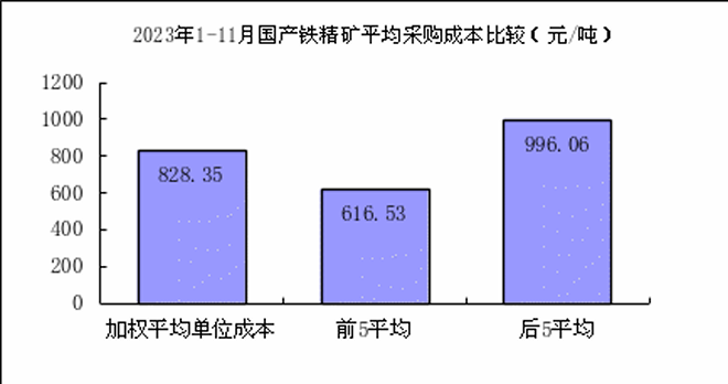 1—11月對標企業國產鐵精礦折算成62%品位的平均采購成本為828.35元/噸,成本最低的前5家企業的加權平均采購成本為616.53元/噸,比對標企業平均采購成本低211.82元/噸,低於平均采購成本25.57%;而采購成本最高的5家企業的加權平均采購成本為996.06元/噸,比對標企業平均采購成本高167.71元/噸,高於平均采購成本20.25%。