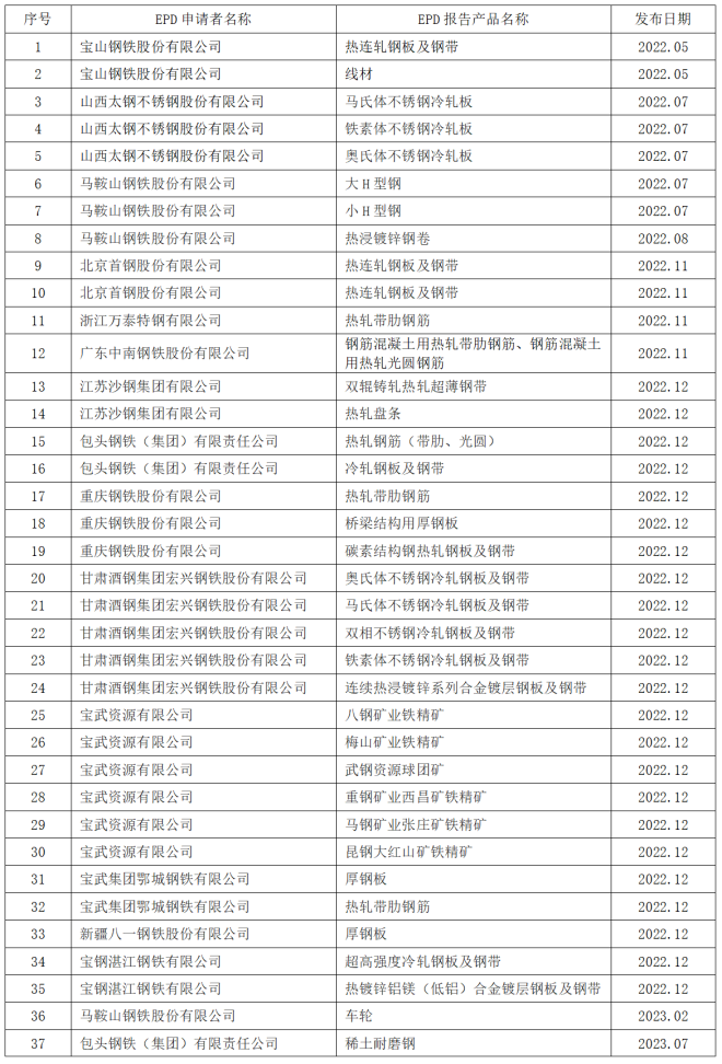 截至2023年12月29日,平台已累計發布產品種類規則(PCR)8份,EPD100份。其中,涉及鋼鐵類產品77份,鐵礦石產品12份,熔劑礦產品8份,空氣分離氣體產品3份。目前,平台注冊用戶3353家,涉及政府部門、鋼鐵企業、鐵礦石企業,以及汽車、家電、建築等用鋼企業、高校及研究機構;入駐平台的第三方認證機構達19家,均為國內外具有較大影響力的認證機構;平台國際影響力正在得到彰顯,WTO、世界鋼協等國際組織予以關注和肯定,並受邀參與COP28“鋼鐵標準原則”發布,為中國零碳鋼標準積極參與國際互認奠定了基礎。