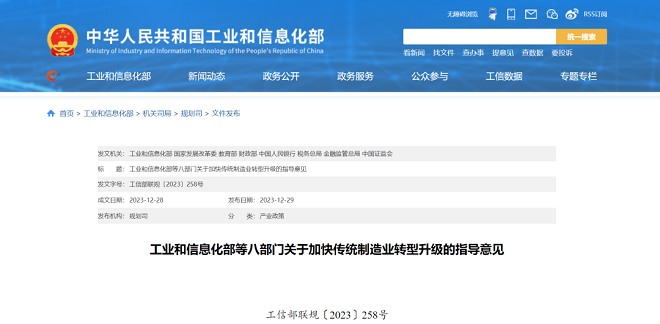 工信部等八部門聯合印發《關於加快傳統製造業轉型升級的指導意見》