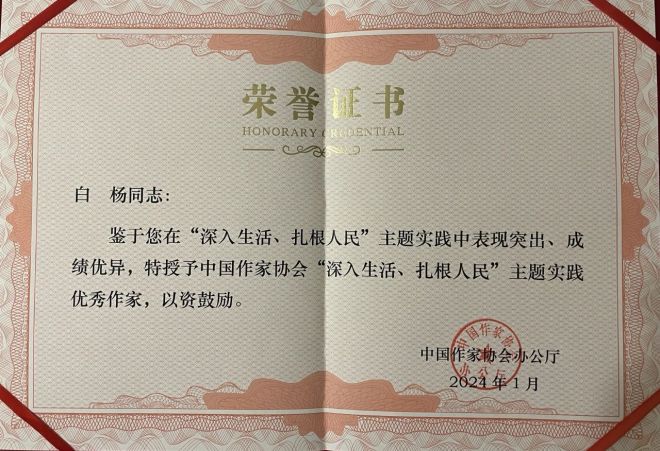 由中國冶金作協推薦的安鋼作家白楊在“深入生活、紮根人民”主題實踐中表現突出、成績優異,被授予中國作家協會“深入生活、紮根人民”主題實踐優秀作家榮譽稱號。