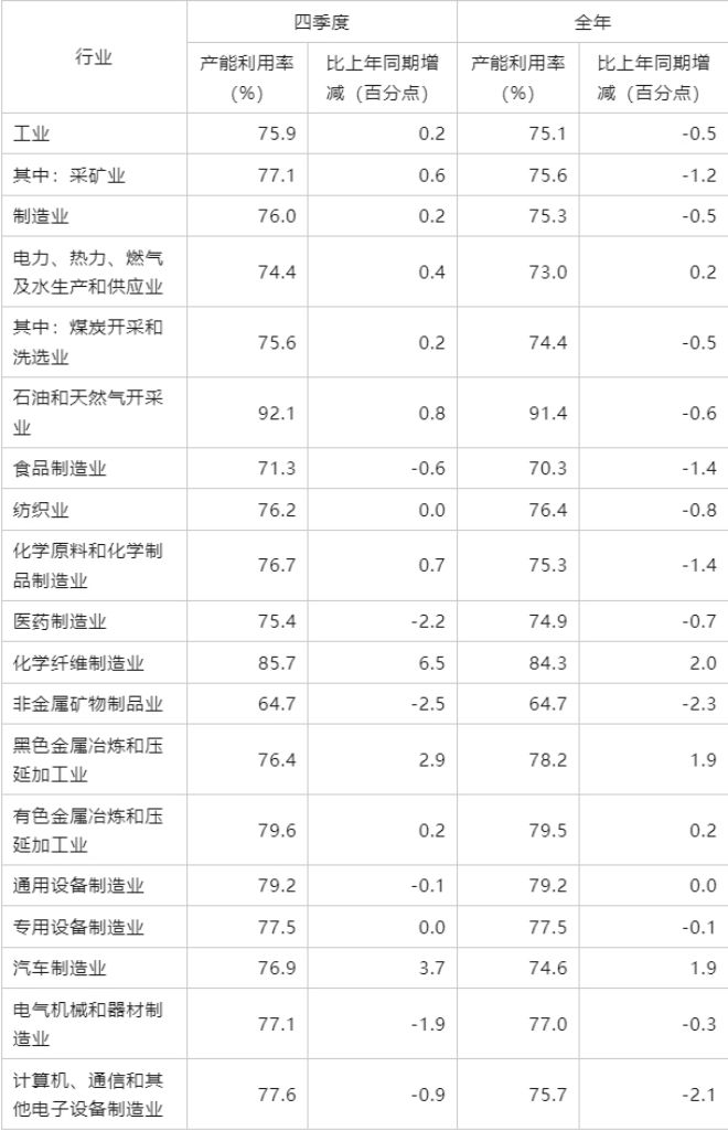 2023年四季度,全國規模以上工業產能利用率為75.9%,比上年同期上升0.2個百分點,比上季度上升0.3個百分點。2023年全國工業產能利用率為75.1%,比上年下降0.5個百分點。