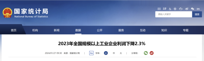 2023年,全國規模以上工業企業實現利潤總額76858.3億元,比上年下降2.3%,降幅比1—11月份收窄2.1個百分點(按可比口徑計算,詳見附注二)。