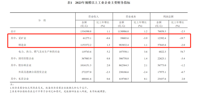 2023年,采礦業實現利潤總額12392.4億元,比上年下降19.7%;製造業實現利潤總額57643.6億元,下降2.0%;電力、熱力、燃氣及水生產和供應業實現利潤總額6822.3億元,增長54.7%。