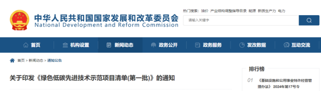 4月16日,中華人民共和國國家發展和改革委員會網站發布了關於印發《綠色低碳先進技術示範項目清單(第一批)》的通知(以下簡稱《通知》)。