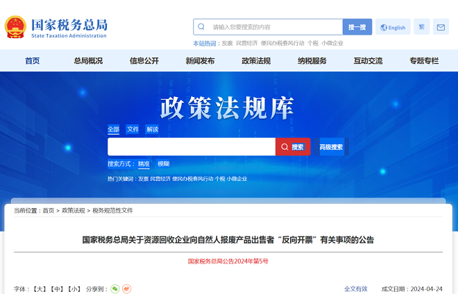 4月24日,國家稅務總局網站發布了關於資源回收企業向自然人報廢產品出售者“反向開票”有關事項的公告。