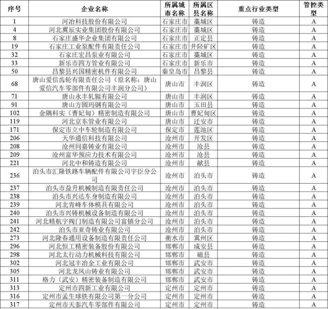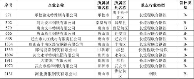 從公示內容可知,河北省重點行業環保績效A級企業清單中共有34家鋼鐵企業,B級企業清單中共有14家鋼鐵企業。具體名單如下:
