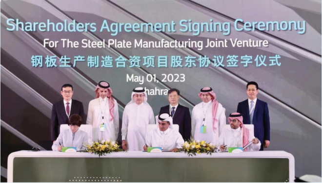 2023年5月1日,寶鋼股份與沙特阿美 、沙特公共投資基金簽 約,共同建設全球首家綠色低碳全流程厚板工廠。