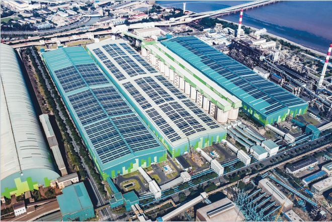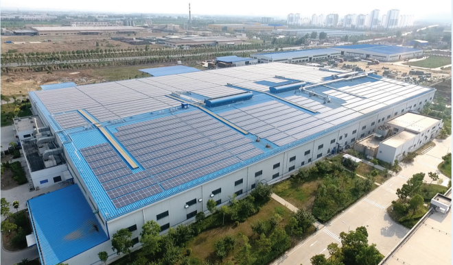 寶鋼包裝6個生產基地獲評國家級“綠色工廠”,3個生產基地獲評省級 “綠色工廠”。圖為寶鋼包裝6家國家級“綠色工廠”之一的河南寶鋼製罐廠廠房屋頂分布式光伏發電。