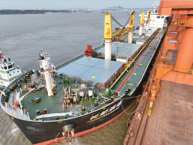 寶武資源首船海外自產鐵礦產品——4.5萬噸利比裏亞邦礦礦粉運抵江蘇鎮江港。