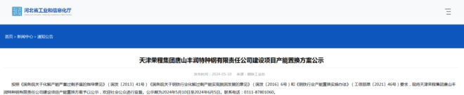 5月10日,河北省工業和信息化廳發布《天津榮程集團唐山豐潤特種鋼有限責任公司建設項目產能置換方案公示》,天津榮程集團唐山豐潤特種鋼有限責任公司將新建70噸電弧爐一座,配套建設70tLF爐2座,70tVOD爐1座,預計2024年8月投產。