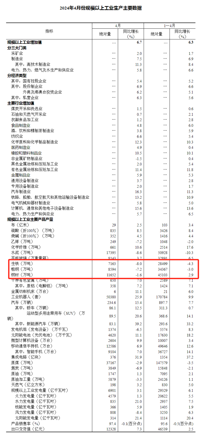2024年4月份,我國鋼材產量11652萬噸,同比下降1.6%;1-4月份,我國鋼材產量45103萬噸,同比增長2.9%。