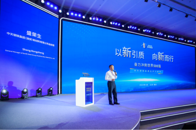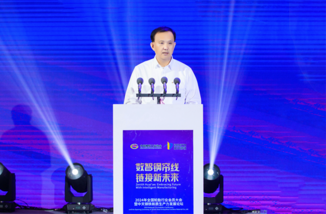 中天鋼鐵集團(淮安)新材料有限公司總經理盛榮生從集團發展曆程、新質生產力發展以及未來展望等三方麵作中天鋼鐵新質生產力發展報告。中天淮安項目總投資202億元,建設160萬噸超高強精品鋼簾線項目,專注於生產ST及UT級鋼簾線。項目占地麵積2802畝,總建築麵積142萬平方米,建設6個生產分廠、技術研發中心、智能裝備中心和客服中心等。項目是全球單體規模最大的精品鋼簾線生產基地,依托5G+工業互聯網平台,在行業內率先實現全過程數字化管控,在效率提升、成本優化、智能化運營等方麵處於領先地位。