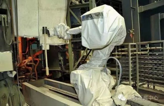 寶鋼股份寶山基地-3CC中間包機器人,不僅可以實現大包長水口的安裝、拆chai卸xie與yu清qing洗xi作zuo業ye等deng複fu雜za動dong作zuo,還hai可ke以yi實shi現xian在zai中zhong間jian包bao內nei鋼gang水shui溫wen度du的de測ce量liang和he取qu樣yang以yi及ji向xiang中zhong間jian包bao內nei加jia覆fu蓋gai劑ji的de功gong能neng,同tong時shi還hai配pei備bei了le異yi常chang情qing況kuang下xia的de燒shao氧yang引yin流liu功gong能neng,屬shu於yu集ji多duo功gong能neng於yu一yi身shen的de澆jiao鋼gang配pei套tao機ji器qi人ren,完wan全quan取qu代dai了le大da包bao操cao作zuo工gong的de作zuo業ye。