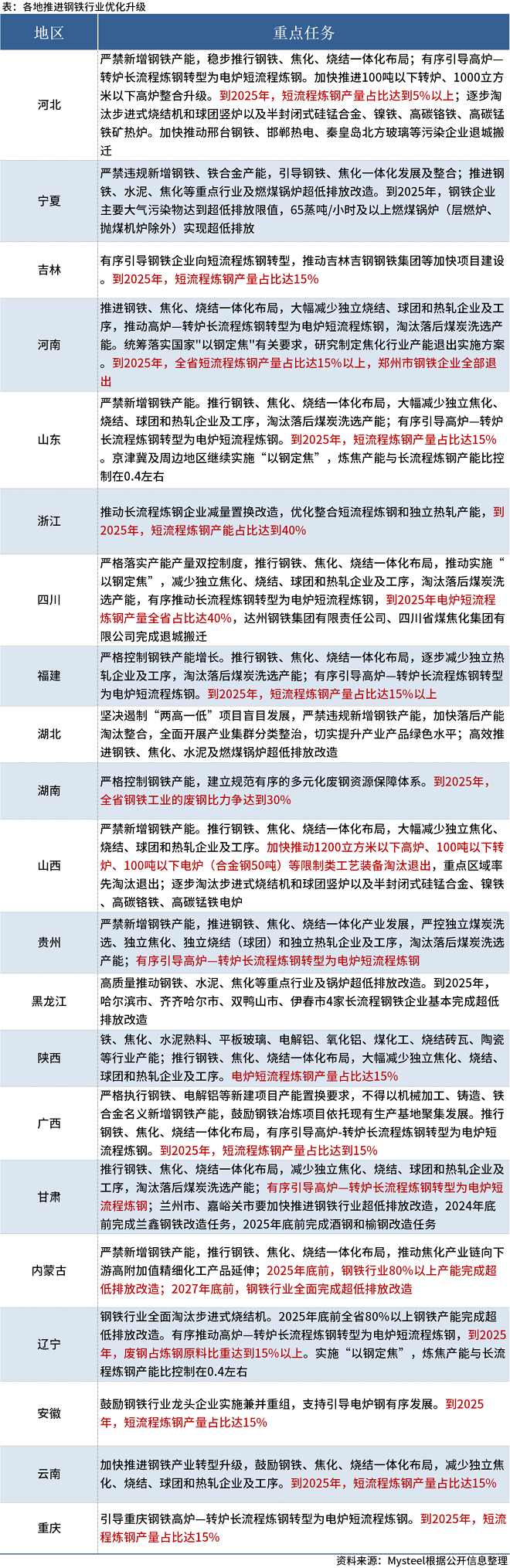 據不完全統計,21個省份出台“空氣質量持續改善行動實施方案”,要求推進鋼鐵等重點行業優化升級,包括嚴禁新增鋼鐵產能,提出短流程煉鋼比例的目標等。多地提出到2025年,短流程煉鋼產量占比達到15%,浙江、四川到2025年短流程煉鋼產量占比達到40%。
