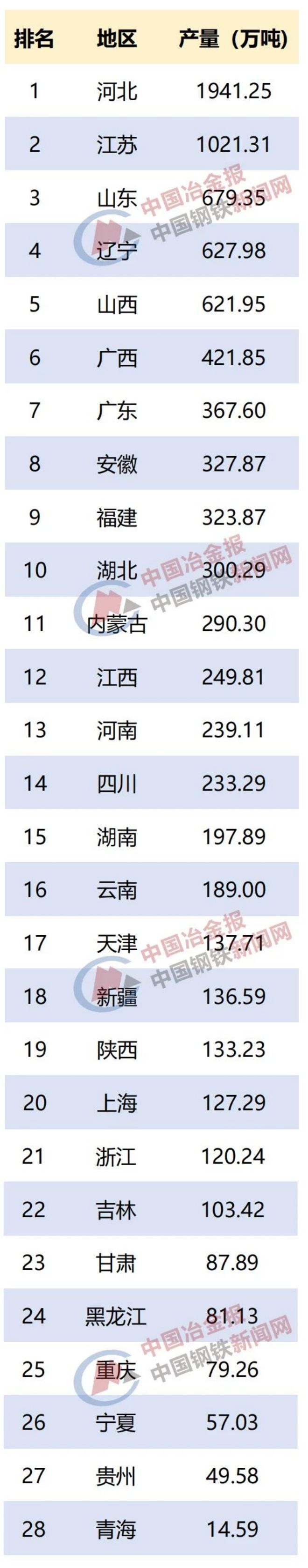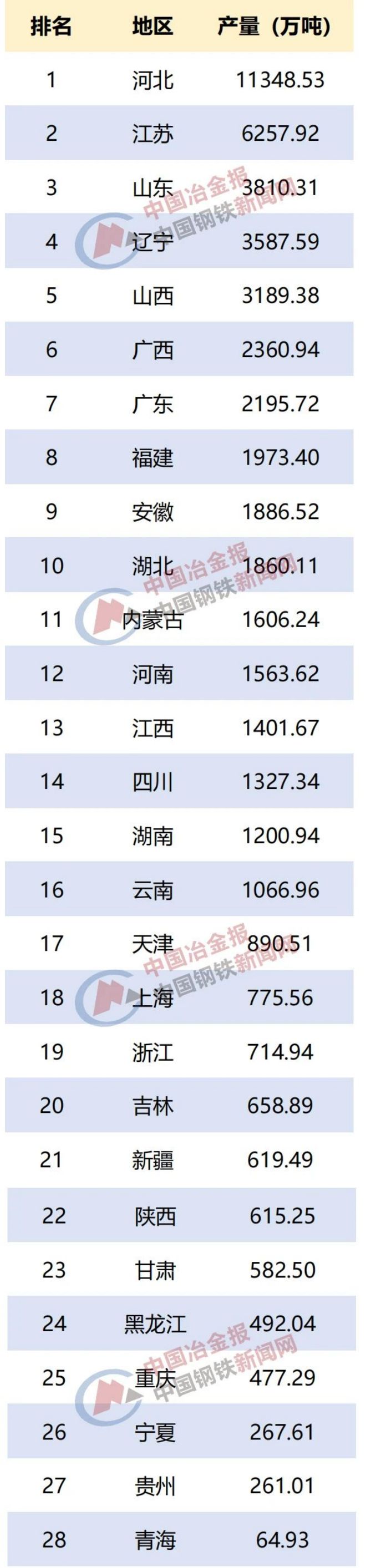 從分省市數據來看,2024年1-6月河北以產量11348.53萬噸位列第一;江蘇產量6257.92萬噸排在第二;山東產量3810.31萬噸排在第三。