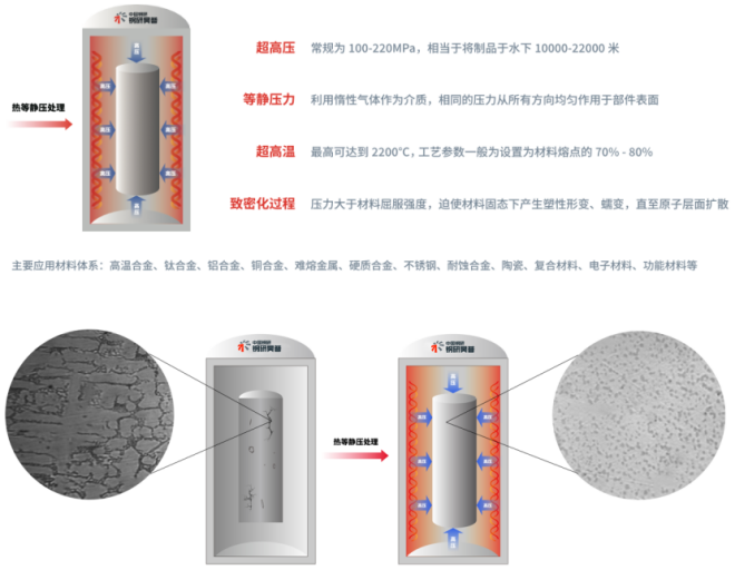 隨著全球科技和工業的快速發展,高性能材料的需求日益增長,特別是在航空航天、能源、醫療等關鍵領域,對材料的性能、質量和可靠性提出了更高要求。熱等靜壓技術是一種先進的材料處理技術,經過熱等靜壓生產或加工的鈦合金、高溫合金、陶瓷或新型複合材料等材料組織均勻,致密度極高,材料內部微孔、裂紋、偏pian析xi等deng材cai料liao缺que陷xian可ke以yi被bei完wan全quan消xiao除chu,通tong常chang具ju有you遠yuan超chao傳chuan統tong工gong藝yi的de穩wen定ding性xing及ji使shi用yong壽shou命ming,能neng極ji大da提ti高gao材cai料liao的de性xing能neng,已yi成cheng為wei新xin材cai料liao製zhi備bei和he加jia工gong中zhong不bu可ke或huo缺que的de重zhong要yao手shou段duan。