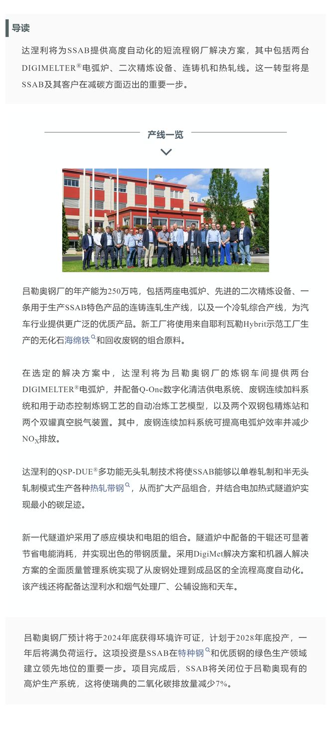 SSAB選擇達涅利作為其瑞典呂勒奧綠色短流程鋼廠的技術提供商