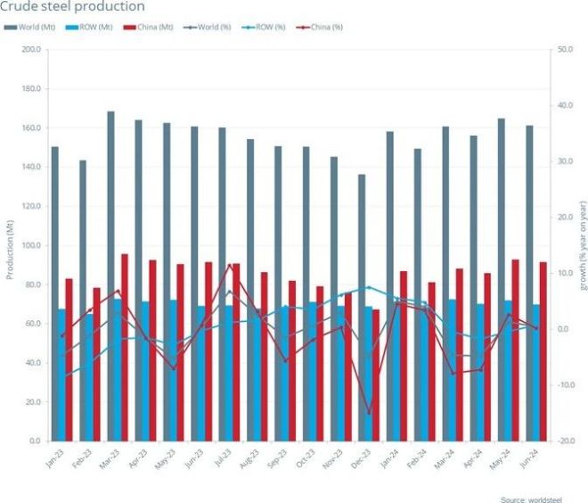 6月全球粗鋼產量為1.614億噸,同比提高0.5%