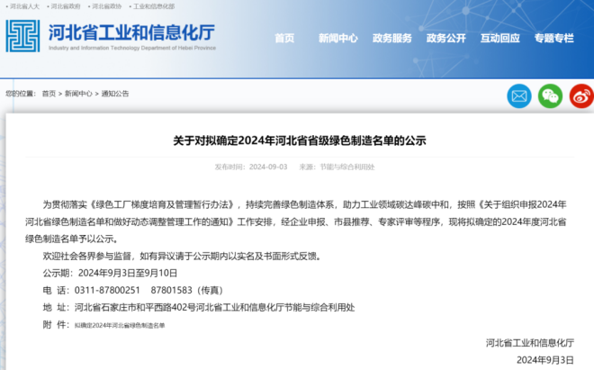 9月3日,河北省工業和信息化廳發布了《關於對擬確定2024年河北省省級綠色製造名單的公示》(點擊公示可觀看全文)。