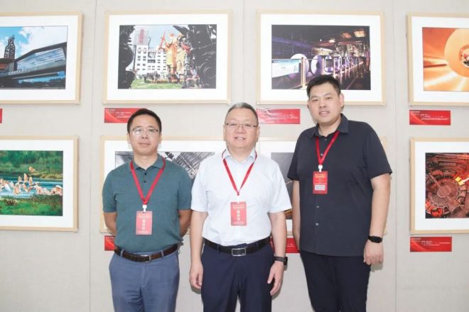 中國冶金報社黨委書記、社長範鐵軍(中),組織人事部(黨委辦公室)主任汪柏根(左),視覺中心主任顧學超在中國冶金報社參展圖片前留影