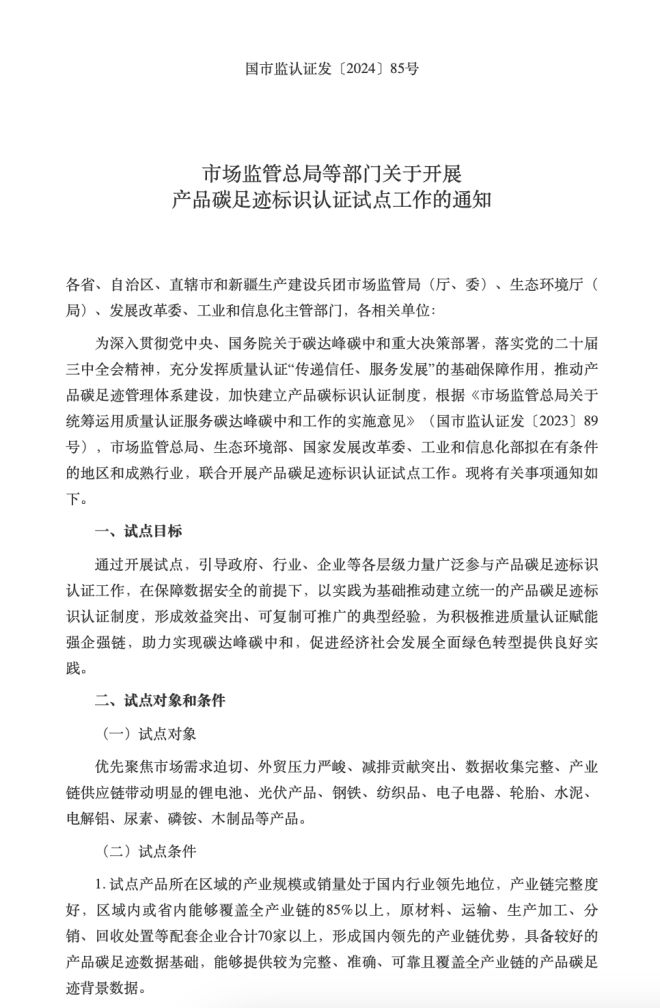 近日,市場監管總局、生態環境部、國家發展改革委、工業和信息化部四部門聯合印發《市場監管總局等部門關於開展產品碳足跡標識認證試點工作的通知》(以下簡稱《通知》),部署開展產品碳足跡標識認證試點工作。