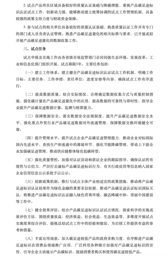 《通知》要求,試點產品所在區域的產業規模或銷量處於國內行業領先地位,產業鏈完整度好,區域內或省內能夠覆蓋全產業鏈的85%以上,原材料、運輸、生產加工、分銷、回收處置等配套企業合計70家以上,形成國內領先的產業鏈優勢,具備較好的產品碳足跡數據基礎,能夠提供較為完整、準確、可靠且覆蓋全產業鏈的產品碳足跡背景數據。各省份申報試點產品不超過2個。本次試點申報及實施工作由各省級市場監管部門會同同級生態環境、發展改革、工業和信息化部門組織開展,試點期限3年。有意願的省級市場監管部門會同有關部門根據試點條件確定試點產品,於2024年9月30日前完成相關報送工作。