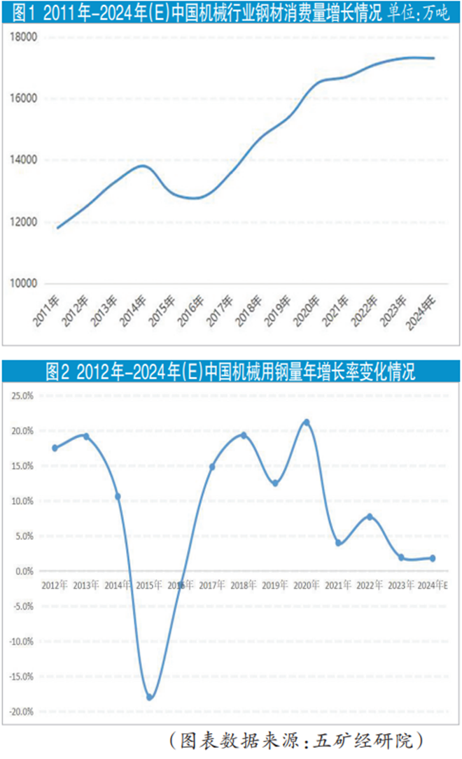 從傳統意義上講,我國將鋼材的消費行業劃分為房地產、基礎設施建設(含鐵路)、汽車、機械、家電、能源、船舶、集裝箱等,即傳統八大用鋼行業。其中,機械是我國鋼材下遊主要消費行業之一。冶金規劃研究院發布的2024年中國鋼材消費量(不計重複材)預測數據顯示,2024年我國機械行業鋼材消費量為1.72億噸,約占全國鋼材消費總量的19.2%。從整體來看,機械設備製造所用的鋼材種類繁多,主要包括合金鋼、碳素調質鋼、彈簧鋼、不鏽鋼、冷鐓鋼、衝壓鋼、滲碳鋼、易切削鋼等。特別需要說明的是,鋼材消費領域談及的機械行業並不包括汽車、船舶行業,如果按照中國機械工業聯合會劃分的統計範圍來計算,我國機械行業用鋼量占比將達到全國用鋼量的35%以上,僅次於房地產行業,是我國鋼材消費第二大戶。國內權威信息機構的統計數據顯示,在國家“十二五”開局之年的2011年,我國機械行業用鋼量為1.25億噸。2024年全國機械行業的鋼材消費量或將達到或超過1.72億噸,增幅為38.4%,幾乎保持著與地產建築行業同樣的增幅比例。