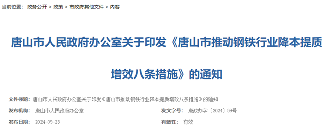 9月23日,唐山市人民政府網站發布了關於印發《唐山市推動鋼鐵行業降本提質增效八條措施》的通知(以下簡稱《通知》)。