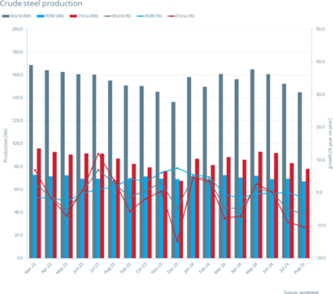 2024年8月全球粗鋼產量同比下降6.5%