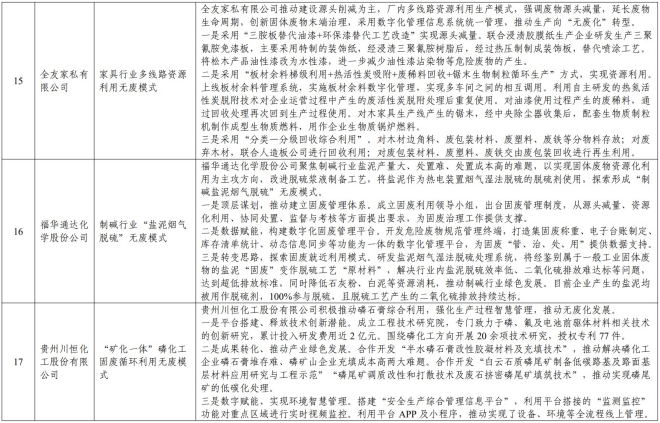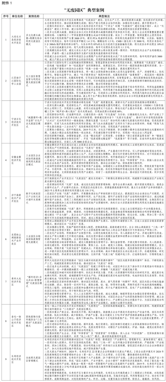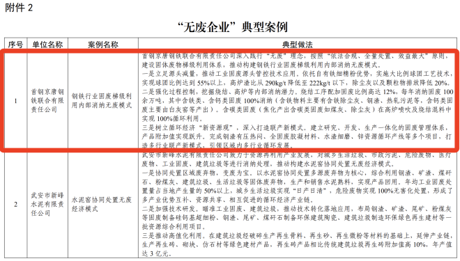 公告中表示:為落實《“十四五”工業綠色發展規劃》《“十四五”時期“無廢城市”建設工作方案》,引導工業園區、工業企業推行無廢生產方式,提高資源利用效率,實現工業固廢源頭減量和就地就近資源化利用,工業和信息化部、生態環境部兩部門征集了一批“無廢園區”“無廢企業”典型案例,共包括9個“無廢園區”、19個“無廢企業”典型案例。