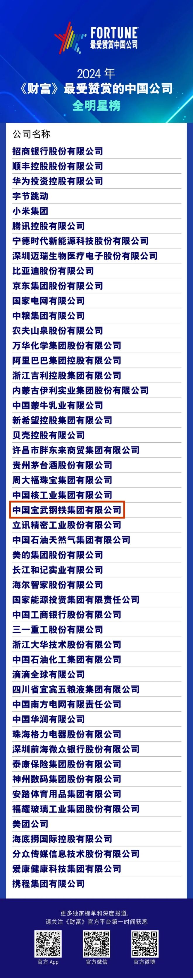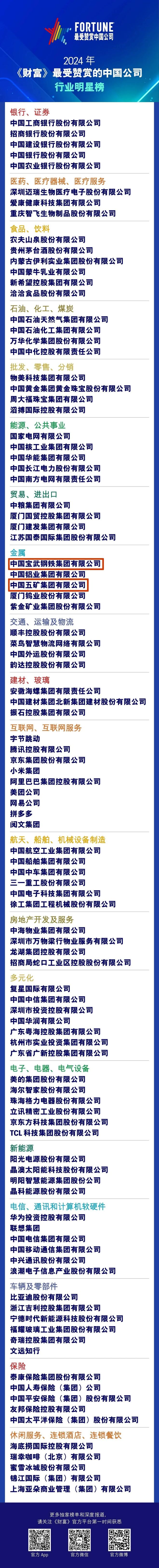 從榜單中獲悉,中國寶武鋼鐵集團有限公司上榜2024年《財富》最受讚賞的中國公司全明星榜與行業明星榜;中國五礦集團有限公司上榜2024年《財富》最受讚賞的中國公司行業明星榜。