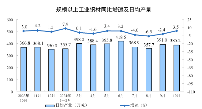 2024年10月份,我國鋼材產量11941萬噸,同比增長3.5%;1-10月份,我國鋼材產量116484萬噸,同比增長0.5%。